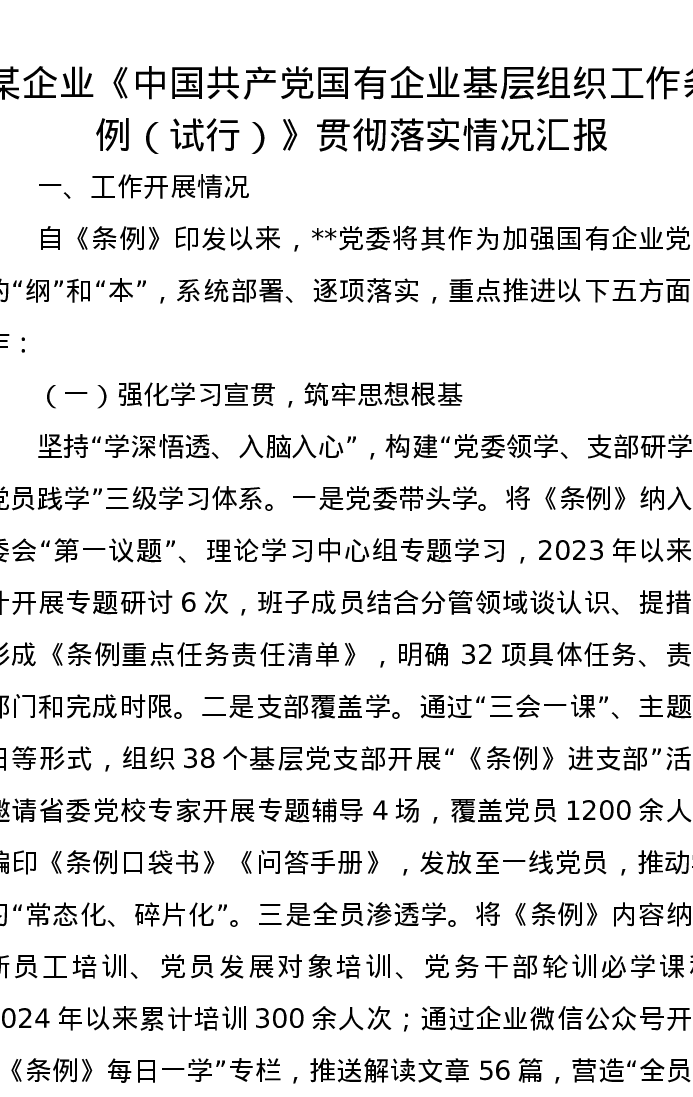 某企业《中国共产党国有企业基层组织工作条例(试行)》贯彻落实情况汇报