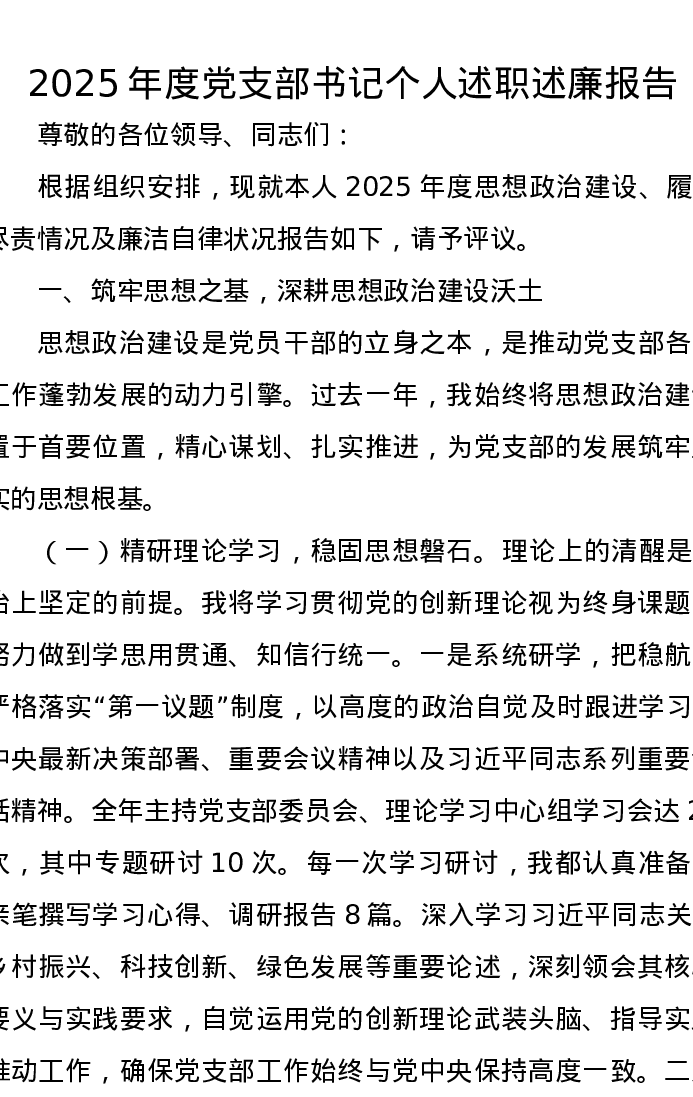 2025年度党支部书记个人述职述廉报告