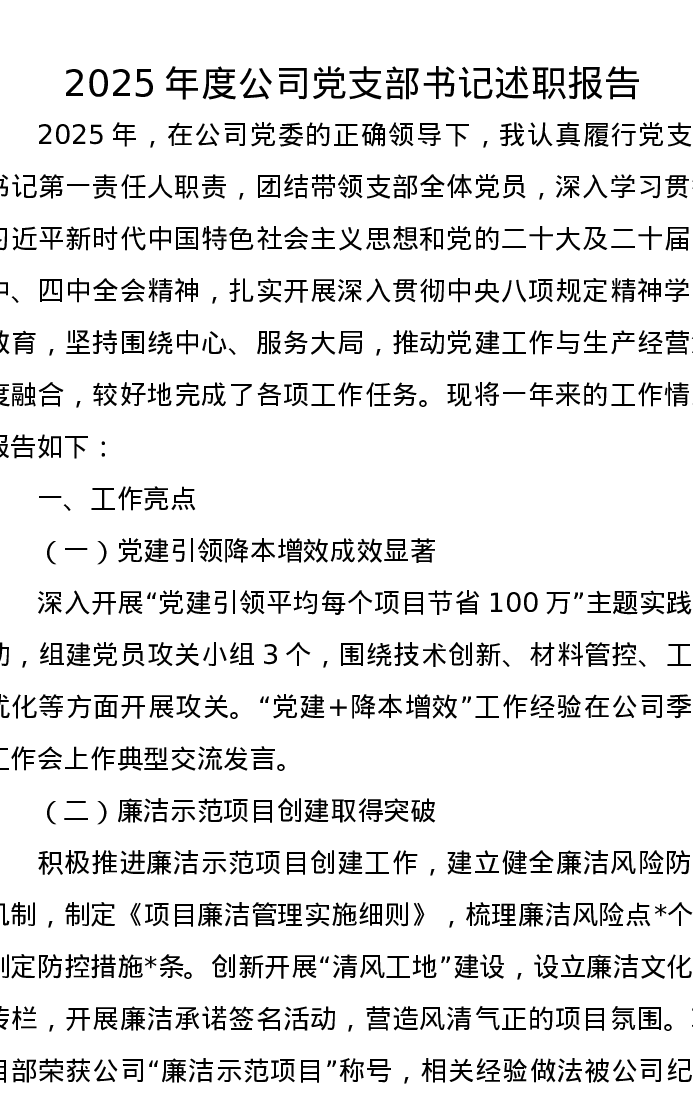 2025年度公司党支部书记述职报告