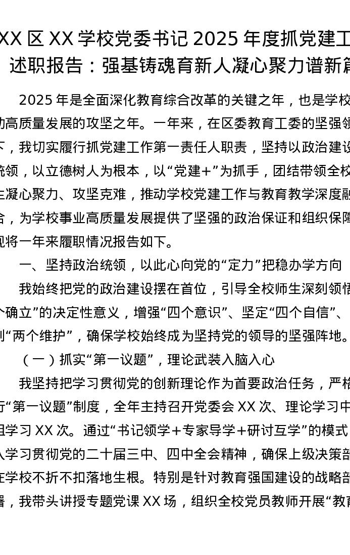 XX区XX学校党委书记2025年度抓党建工作述职报告:强基铸魂育新人 凝心聚力谱新篇
