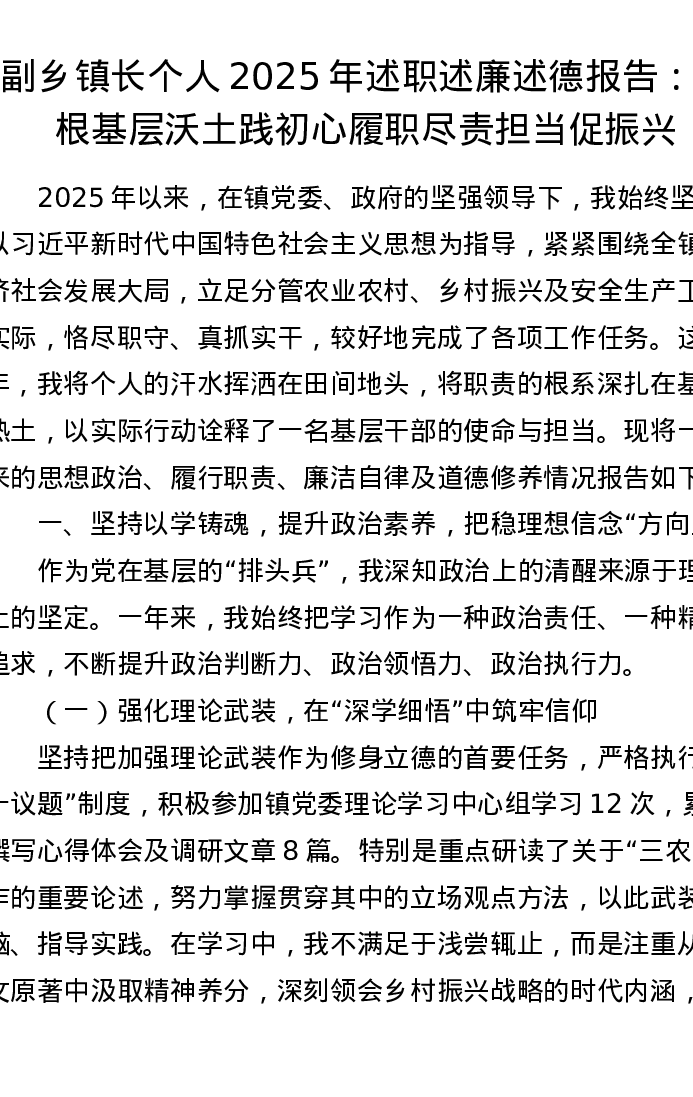 副乡镇长个人2025年述职述廉述德报告:扎根基层沃土践初心 履职尽责担当促振兴