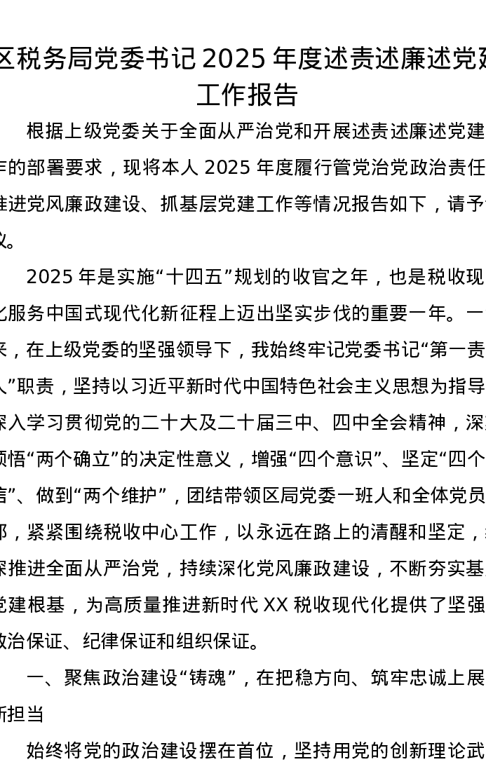 区税务局党委书记2025年度述责述廉述党建工作报告