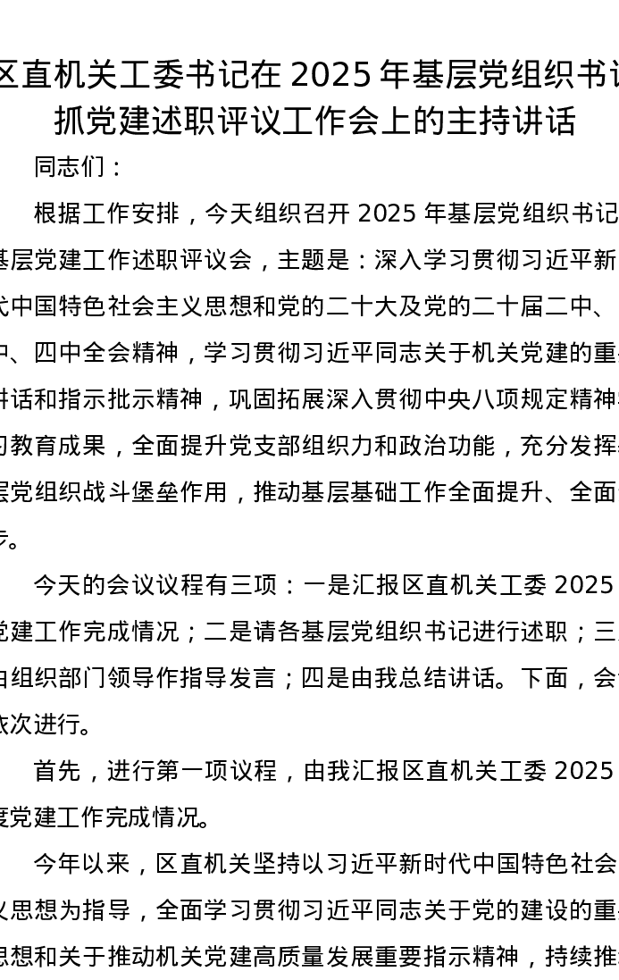 区直机关工委书记在2025年基层党组织书记抓党建述职评议工作会上的主持讲话