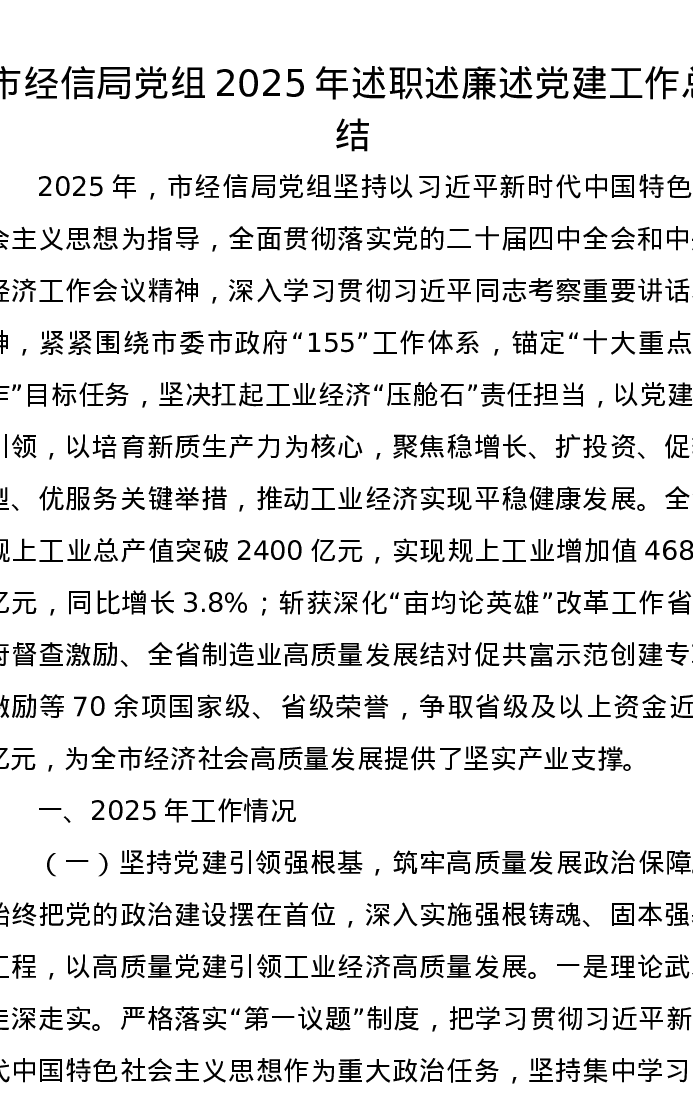 市经信局党组2025年述职述廉述党建工作总结