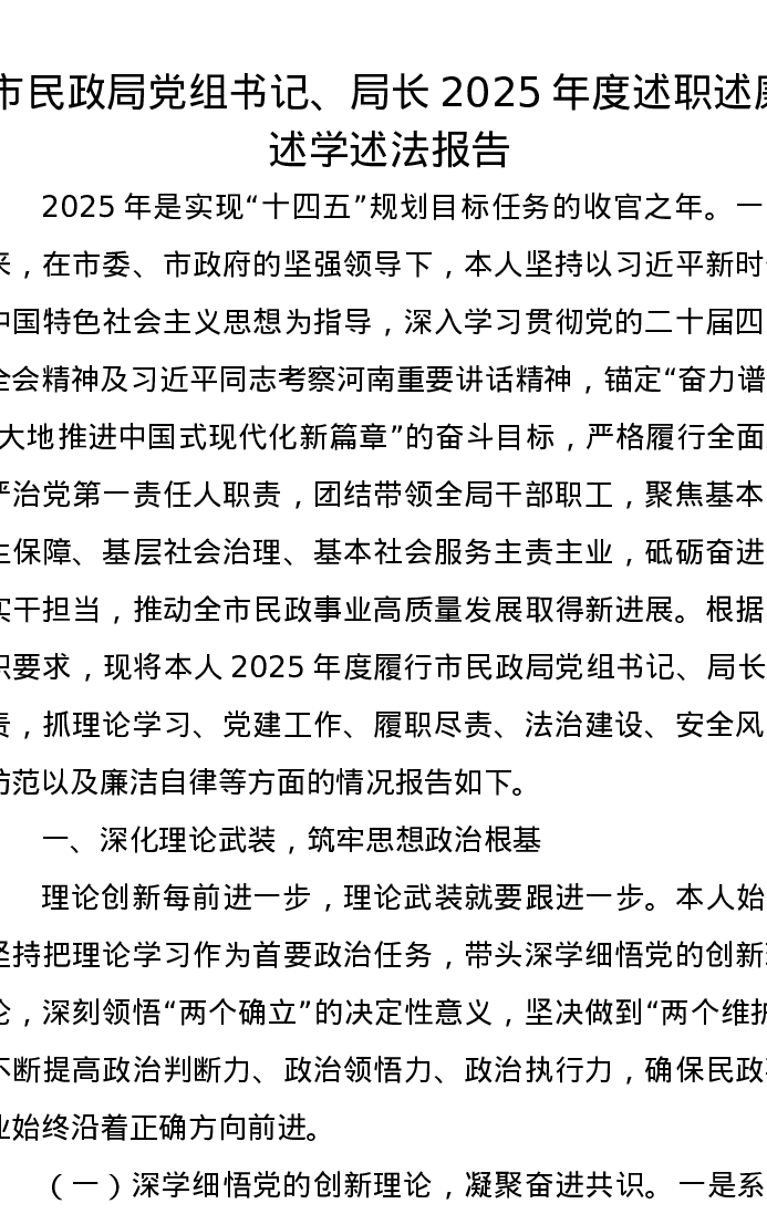 市民政局党组书记、局长2025年度述职述廉述学述法报告