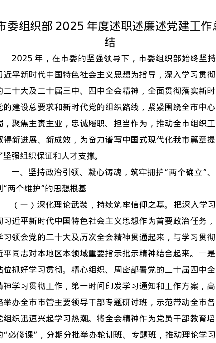 市委组织部2025年度述职述廉述党建工作总结