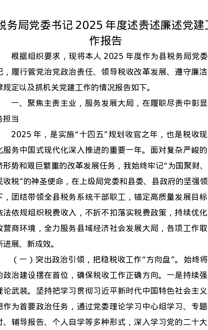 税务局党委书记2025年度述责述廉述党建工作报告