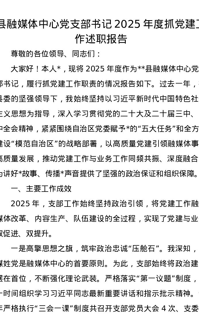 县融媒体中心党支部书记2025年度抓党建工作述职报告