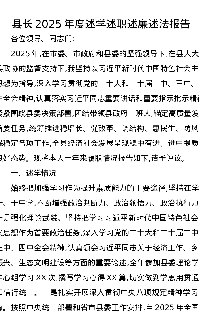 县长2025年度述学述职述廉述法报告