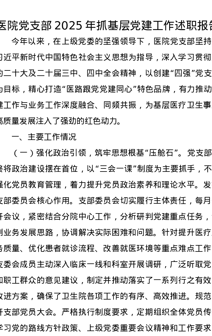 医院党支部2025年抓基层党建工作述职报告