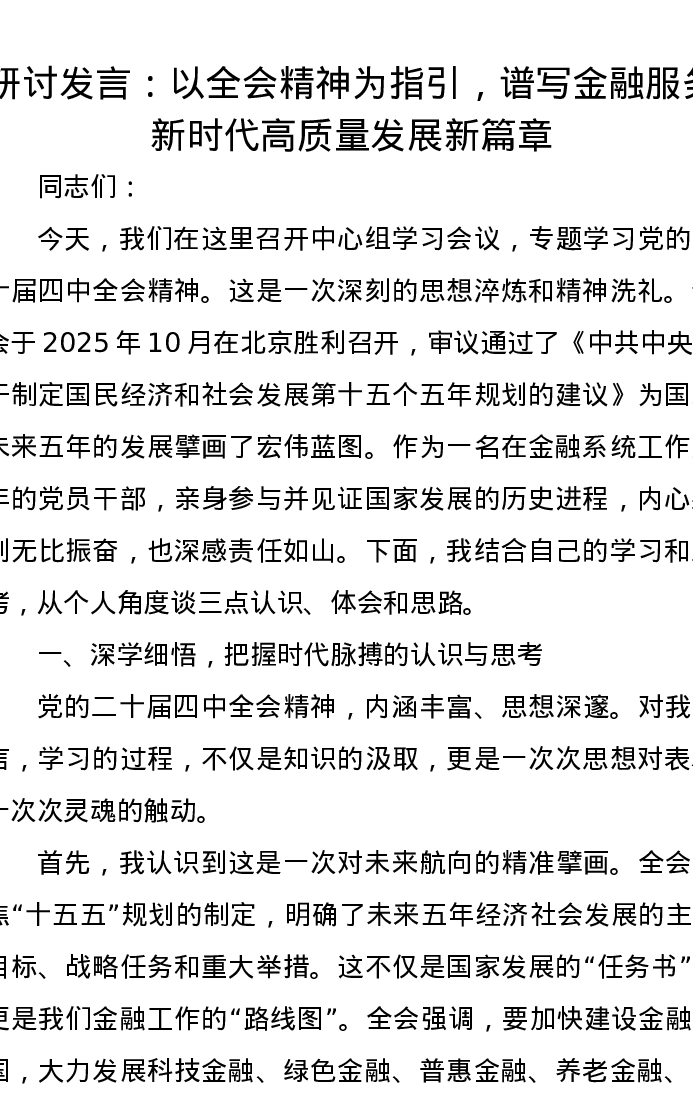 研讨发言:以全会精神为指引,谱写金融服务新时代高质量发展新篇章