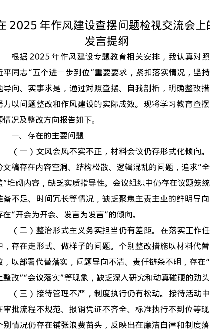 在2025年作风建设查摆问题检视交流会上的发言提纲