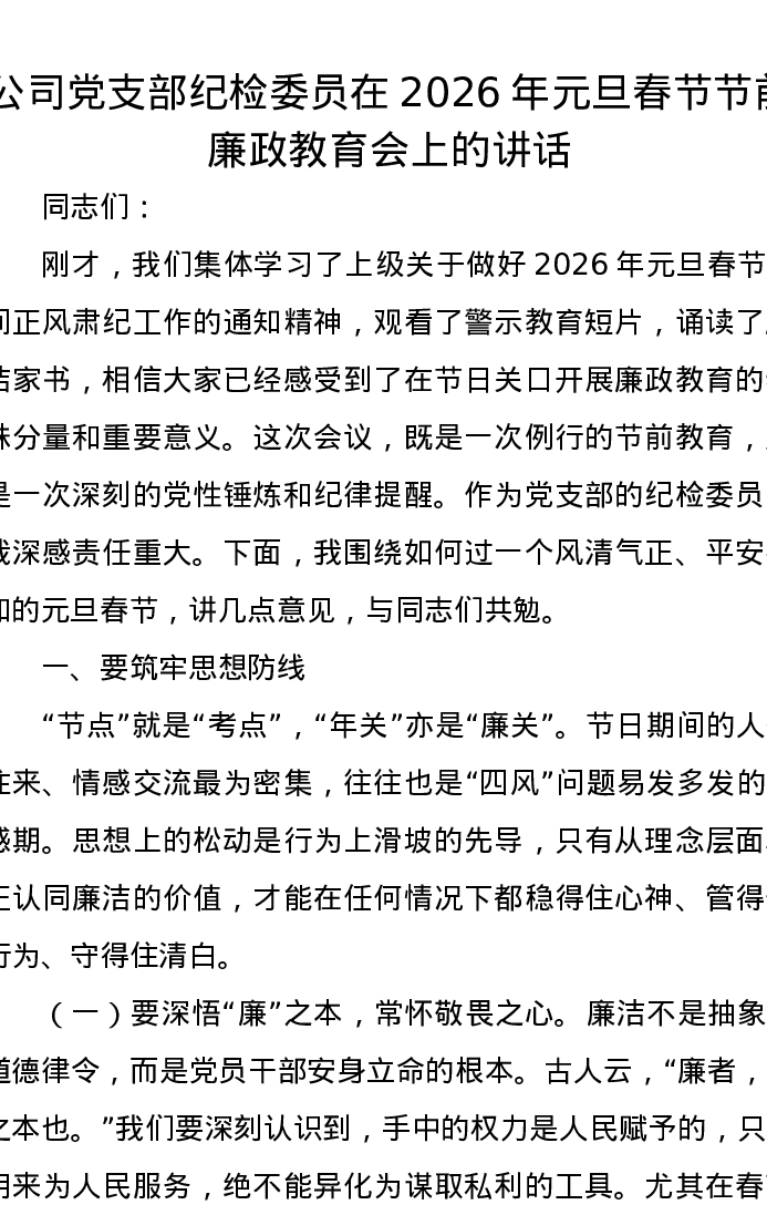 公司党支部纪检委员在2026年元旦春节节前廉政教育会上的讲话