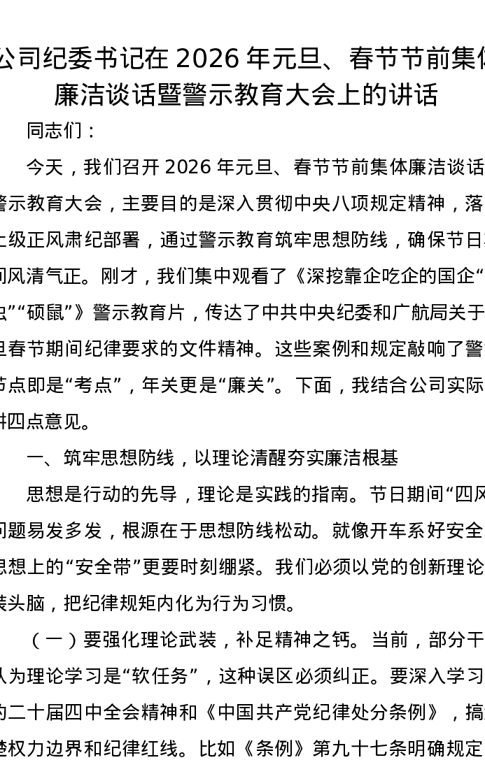 公司纪委书记在2026年元旦、春节节前集体廉洁谈话暨警示教育大会上的讲话