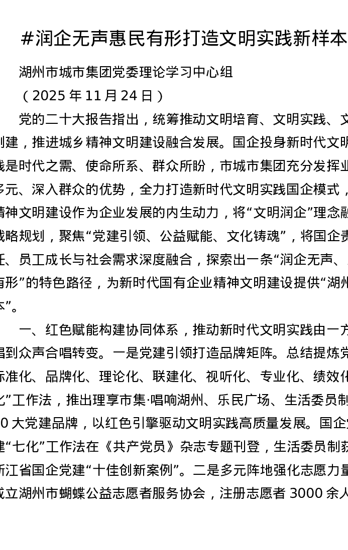 湖州市城市集团党委理论学习中心组讲话:润企无声惠民有形打造文明实践新样本