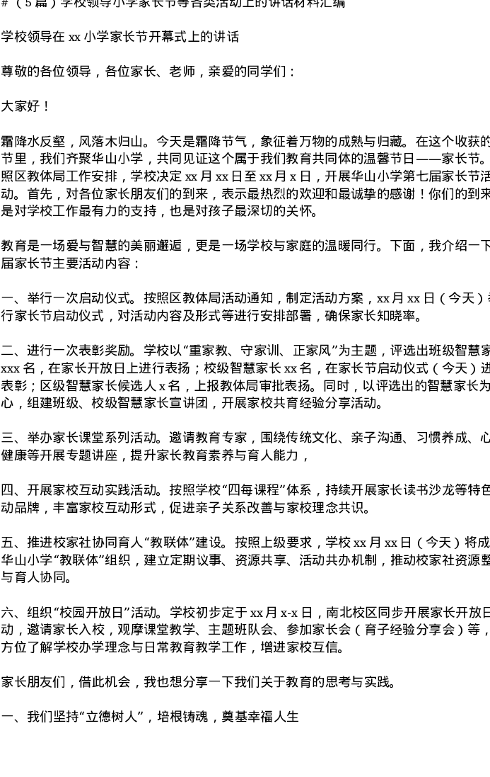 汇编:学校领导小学家长节等各类活动上的讲话5篇