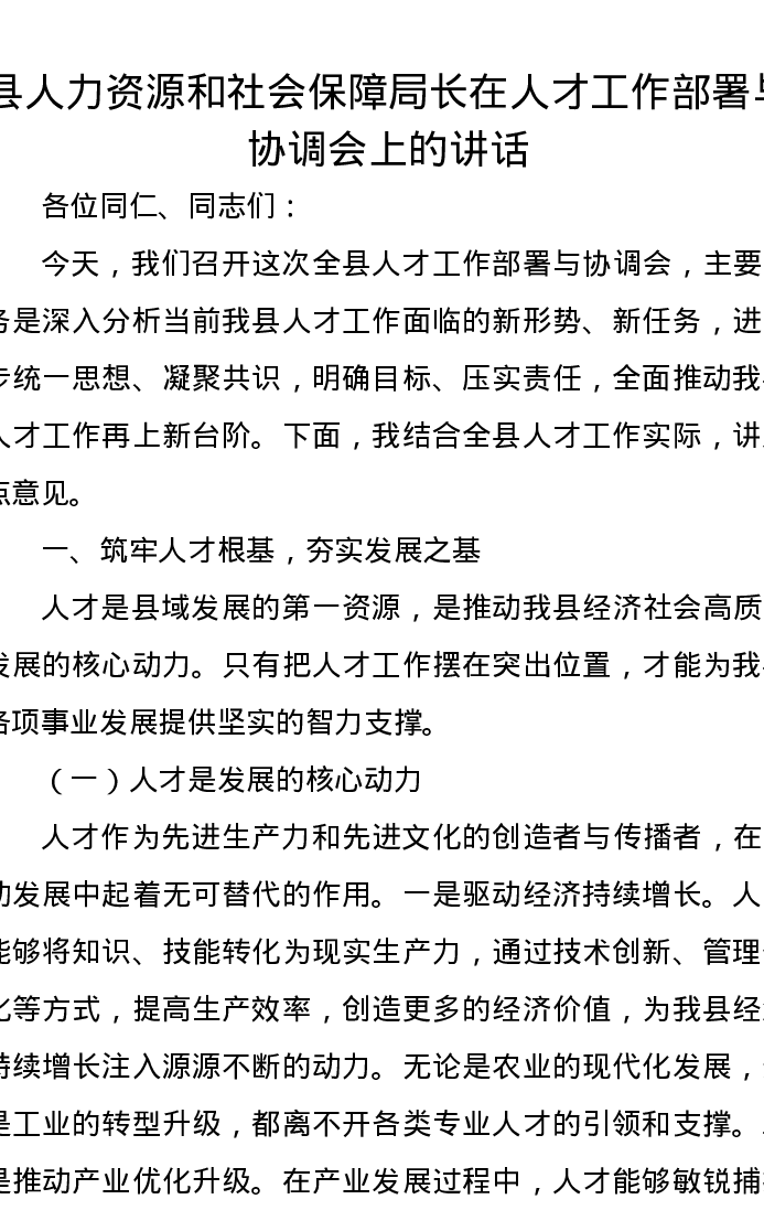 县人力资源和社会保障局长在人才工作部署与协调会上的讲话