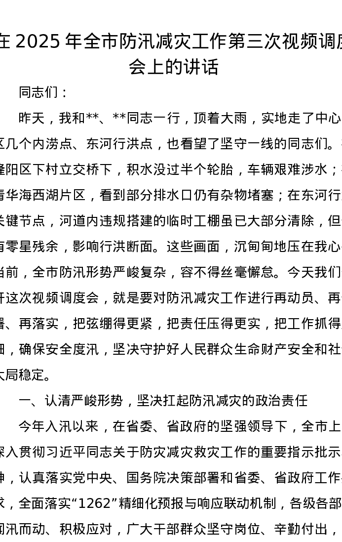在2025年全市防汛减灾工作第三次视频调度会上的讲话