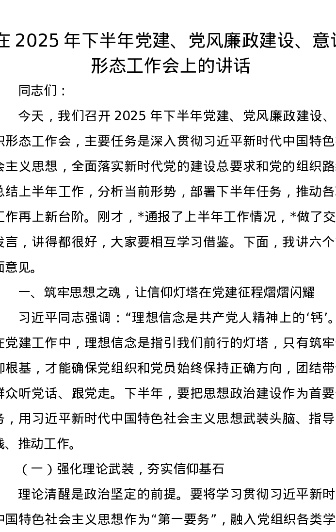 在2025年下半年党建、党风廉政建设、意识形态工作会上的讲话