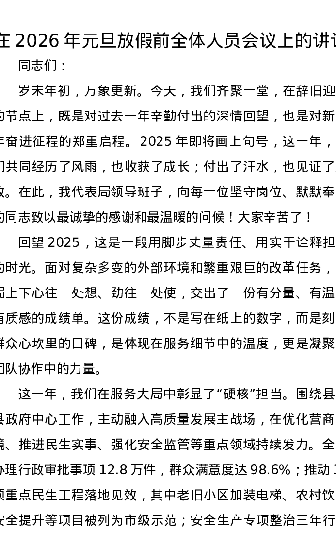 在2026年元旦放假前全体人员会议上的讲话