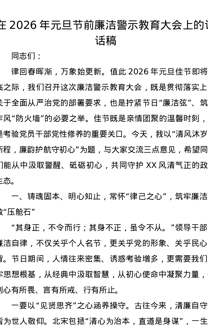 在2026年元旦节前廉洁警示教育大会上的讲话稿