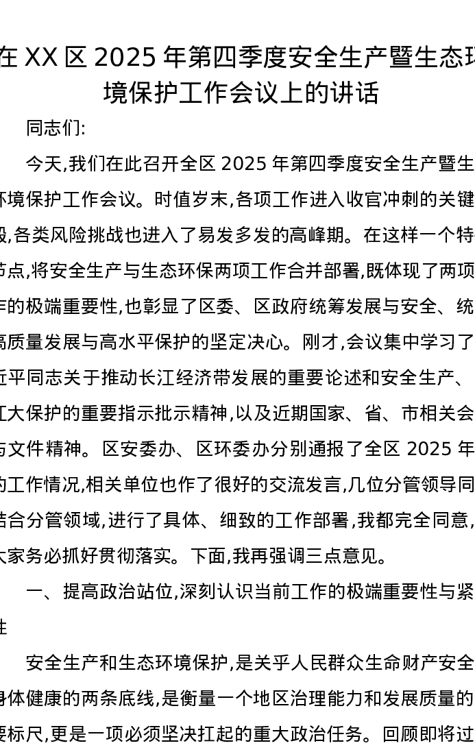 在XX区2025年第四季度安全生产暨生态环境保护工作会议上的讲话2