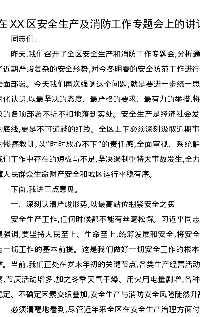 在XX区安全生产及消防工作专题会上的讲话