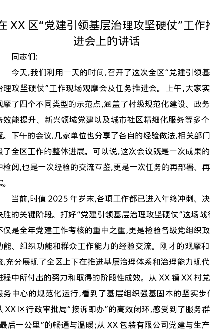 在XX区党建引领基层治理攻坚硬仗工作推进会上的讲话2