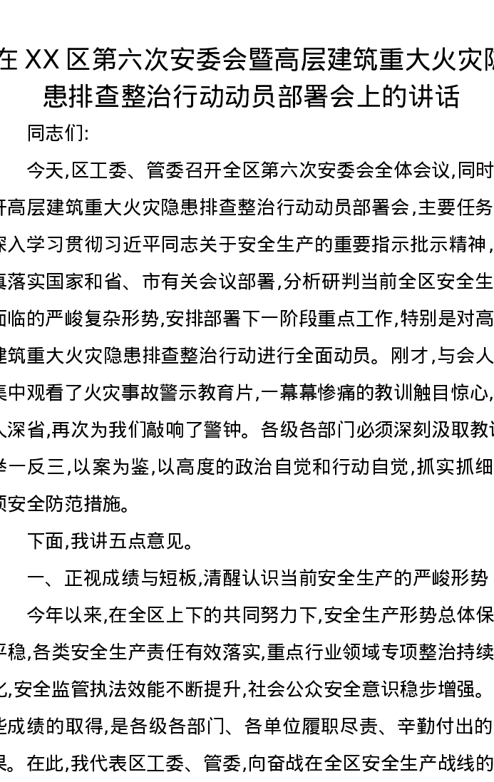 在XX区第六次安委会暨高层建筑重大火灾隐患排查整治行动动员部署会上的讲话2