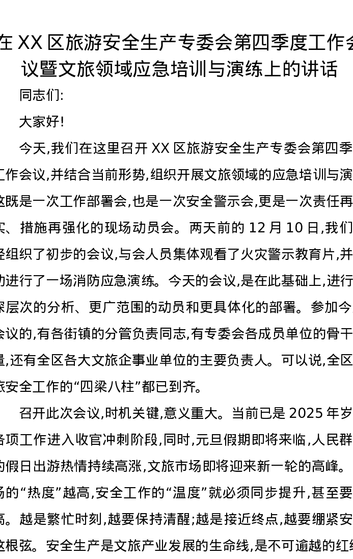 在XX区旅游安全生产专委会第四季度工作会议暨文旅领域应急培训与演练上的讲话2