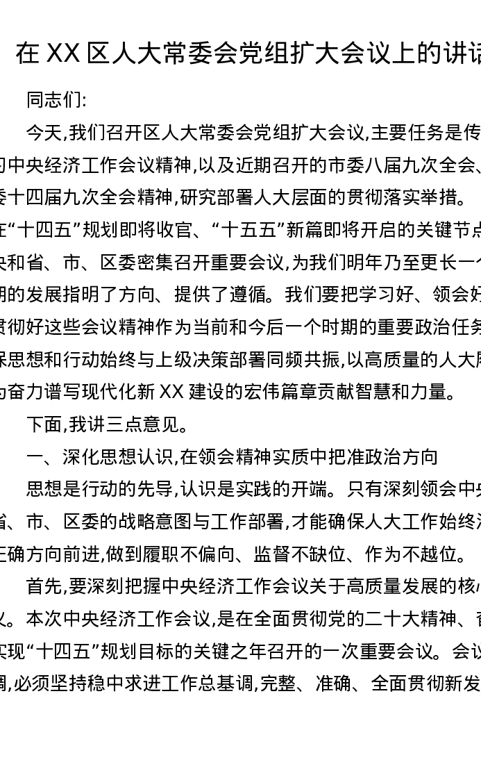 在XX区人大常委会党组扩大会议上的讲话
