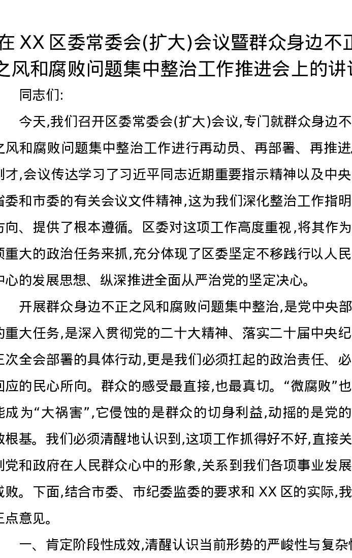 在XX区委常委会(扩大)会议暨群众身边不正之风和腐败问题集中整治工作推进会上的讲话
