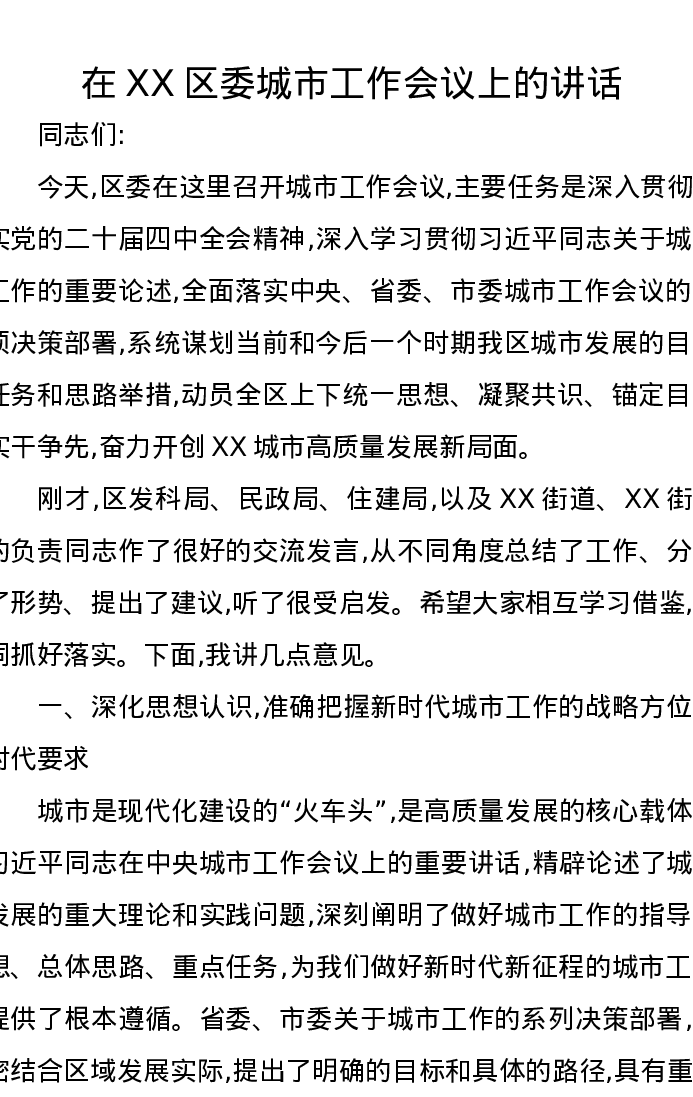 在XX区委城市工作会议上的讲话