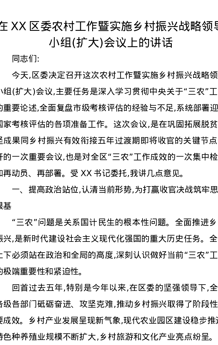 在XX区委农村工作暨实施乡村振兴战略领导小组(扩大)会议上的讲话