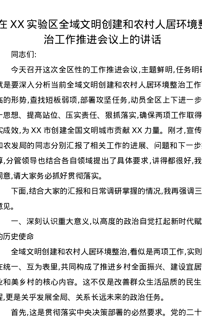 在XX实验区全域文明创建和农村人居环境整治工作推进会议上的讲话