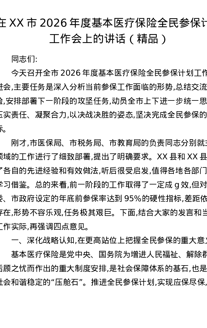 在XX市2026年度基本医疗保险全民参保计划工作会上的讲话