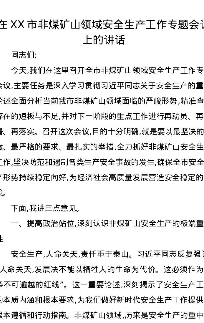 在XX市非煤矿山领域安全生产工作专题会议上的讲话