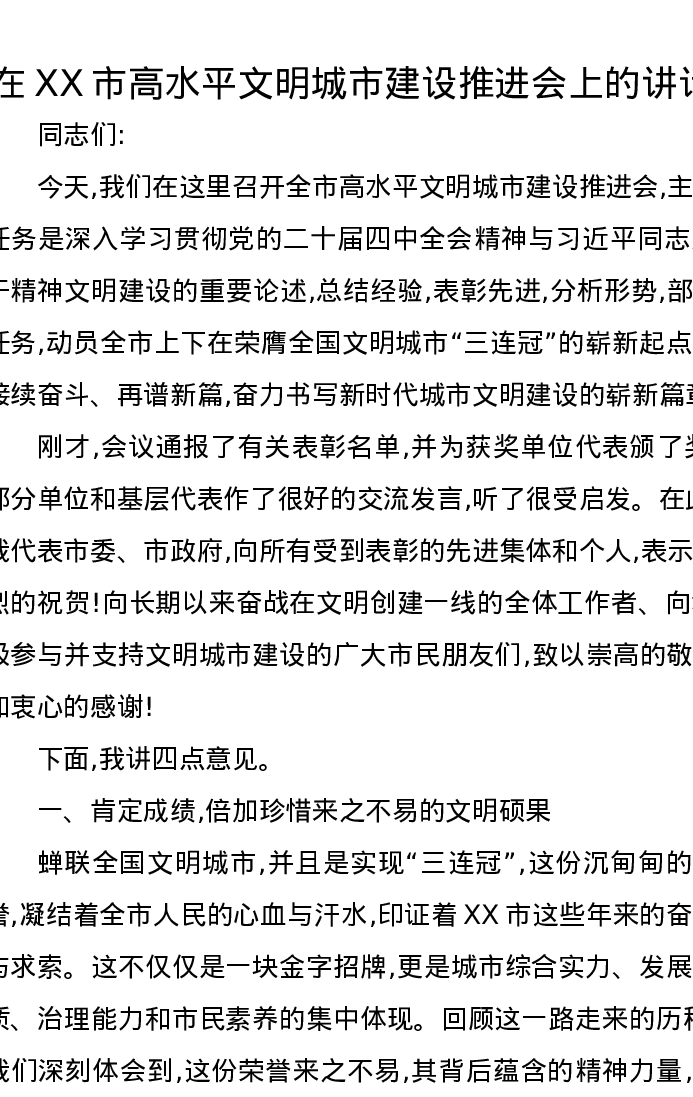 在XX市高水平文明城市建设推进会上的讲话