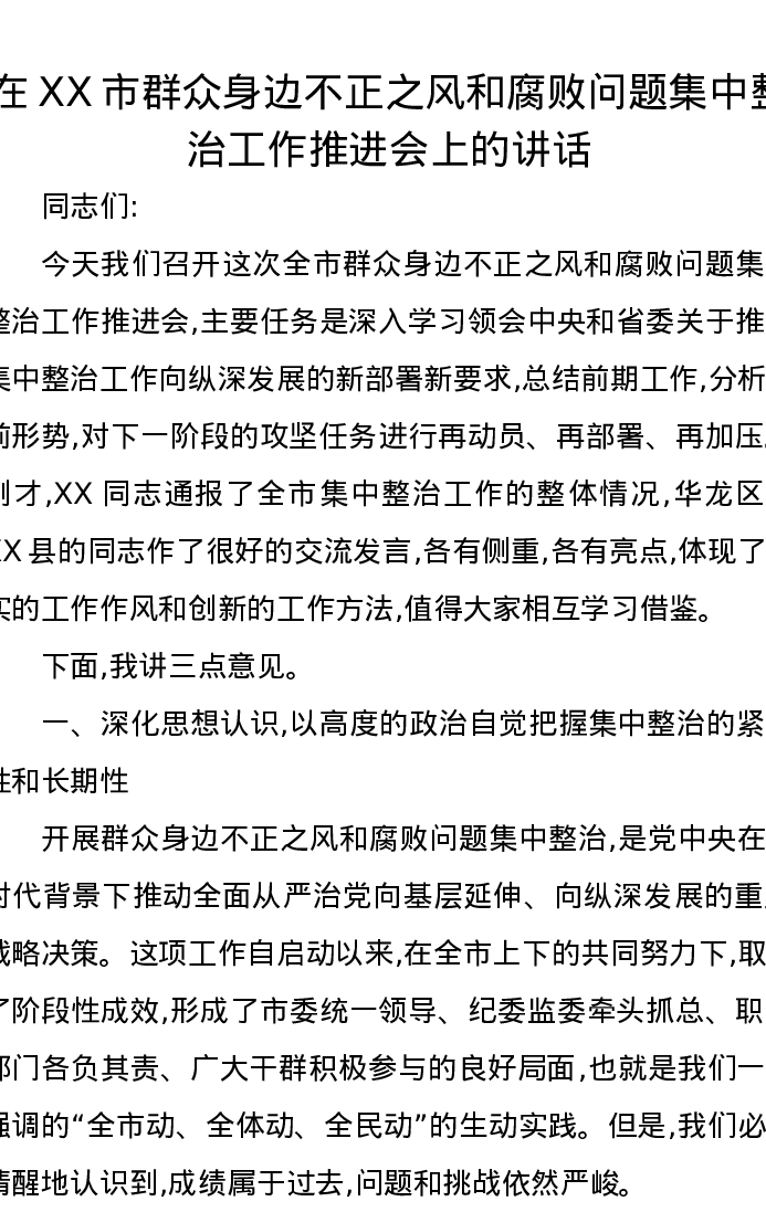 在XX市群众身边不正之风和腐败问题集中整治工作推进会上的讲话1