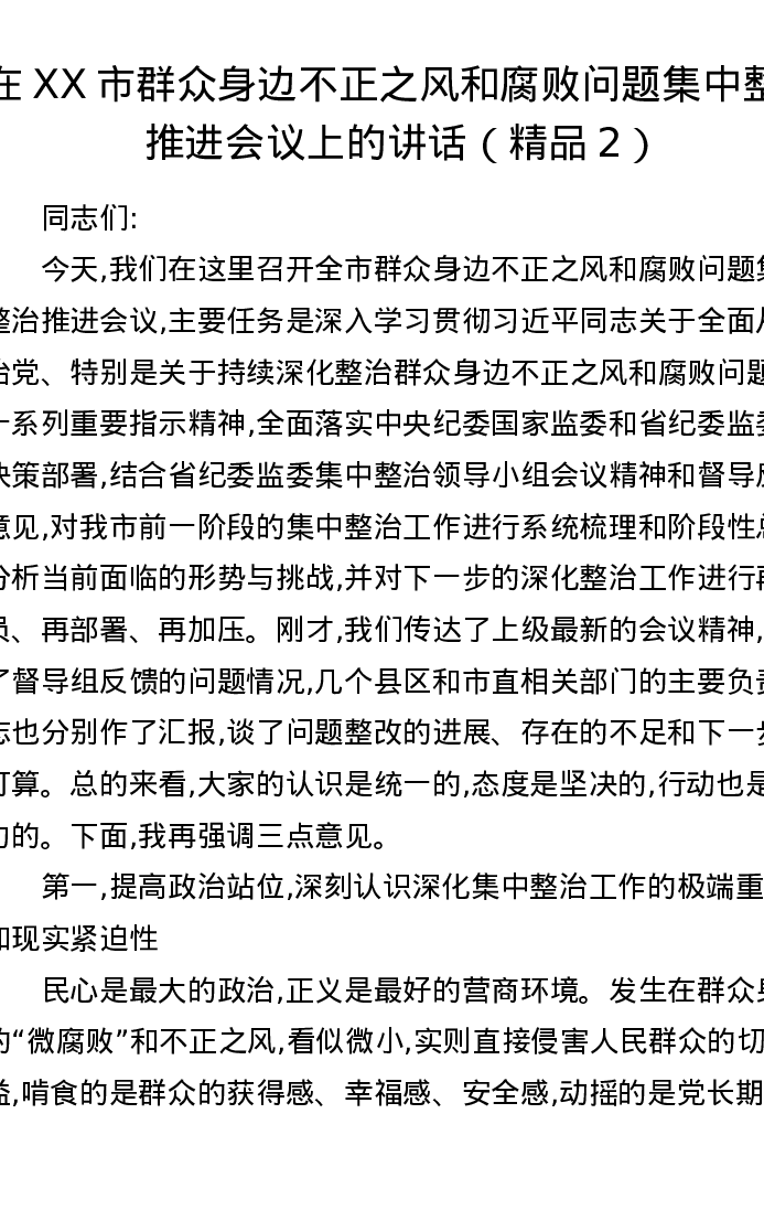 在XX市群众身边不正之风和腐败问题集中整治推进会议上的讲话2