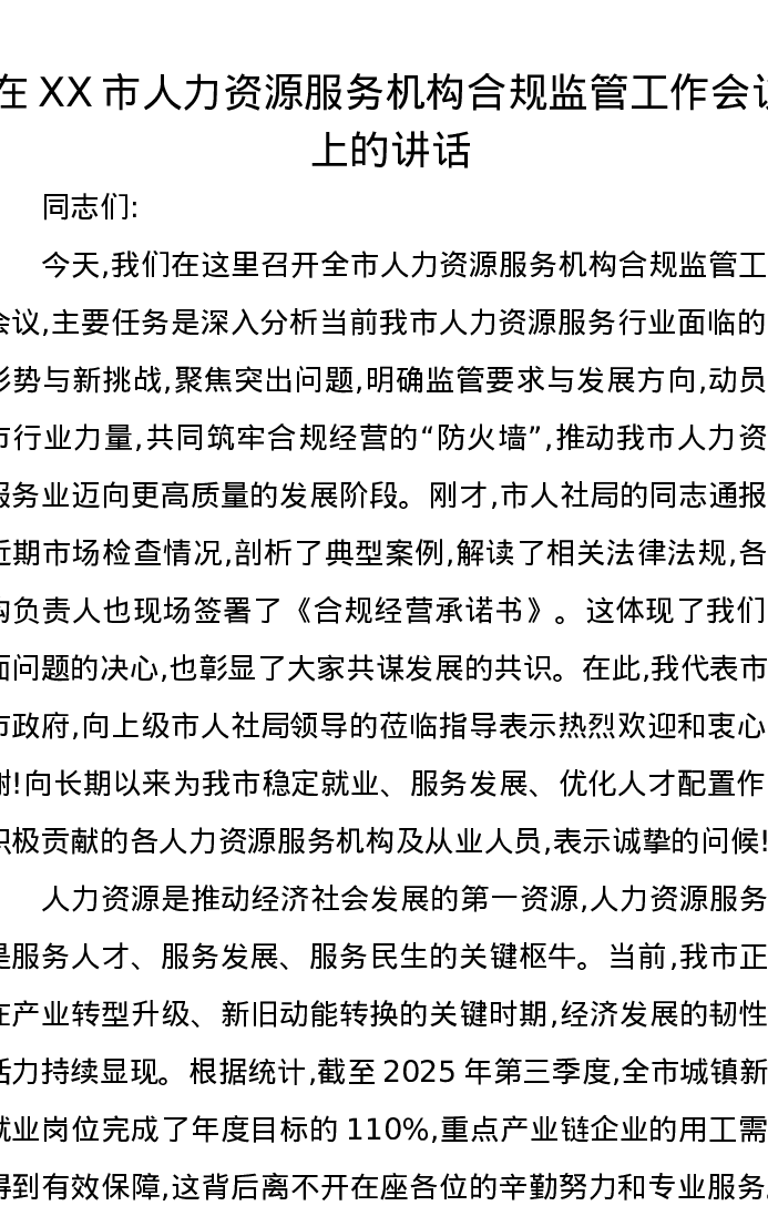 在XX市人力资源服务机构合规监管工作会议上的讲话