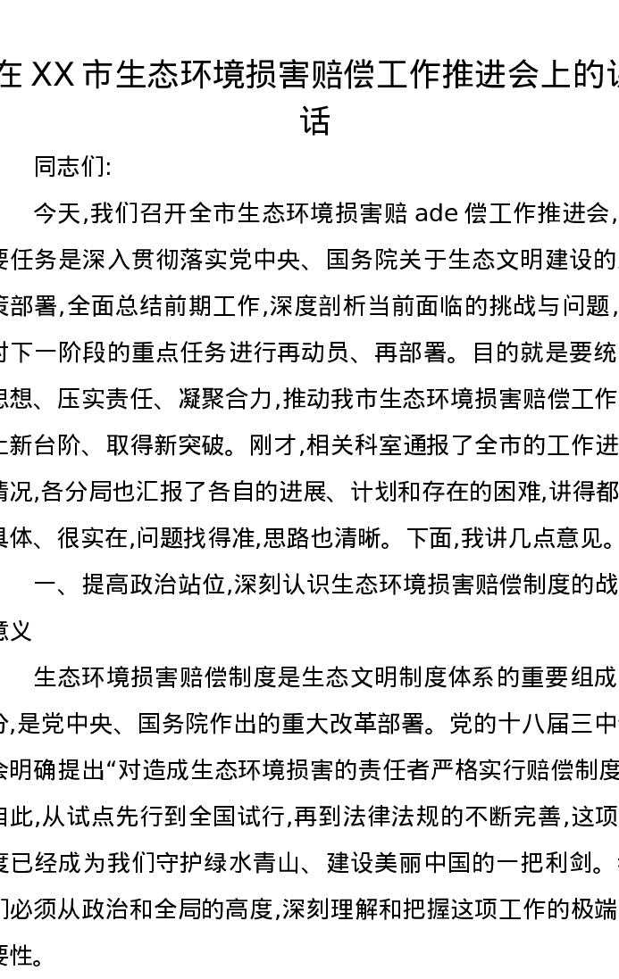 在XX市生态环境损害赔偿工作推进会上的讲话