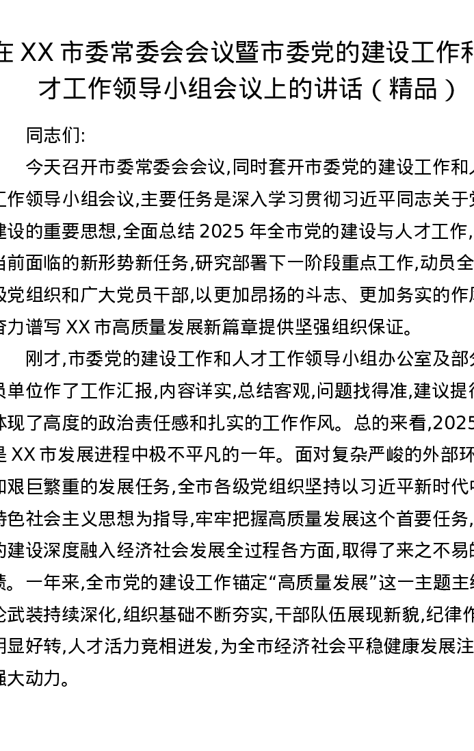 在XX市委常委会会议暨市委党的建设工作和人才工作领导小组会议上的讲话