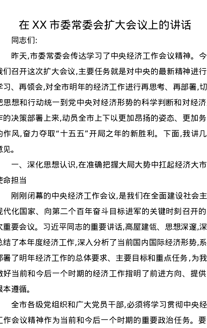在XX市委常委会扩大会议上的讲话2(中央经济工作会议)