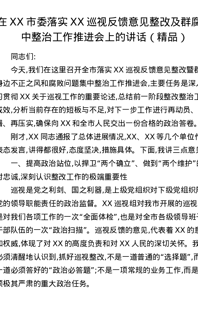 在XX市委落实XX巡视反馈意见整改及群腐集中整治工作推进会上的讲话