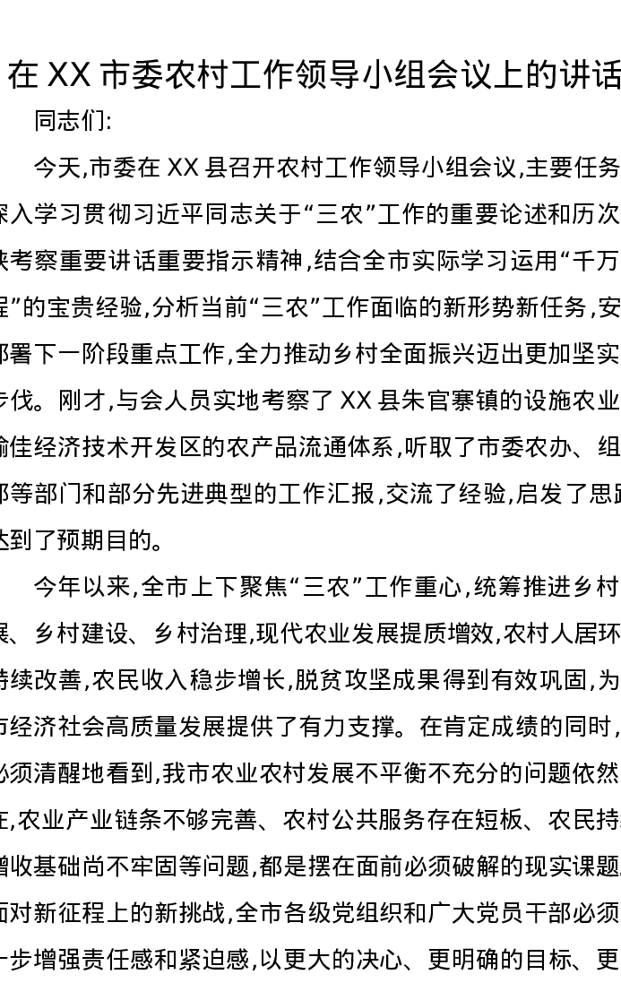 在XX市委农村工作领导小组会议上的讲话