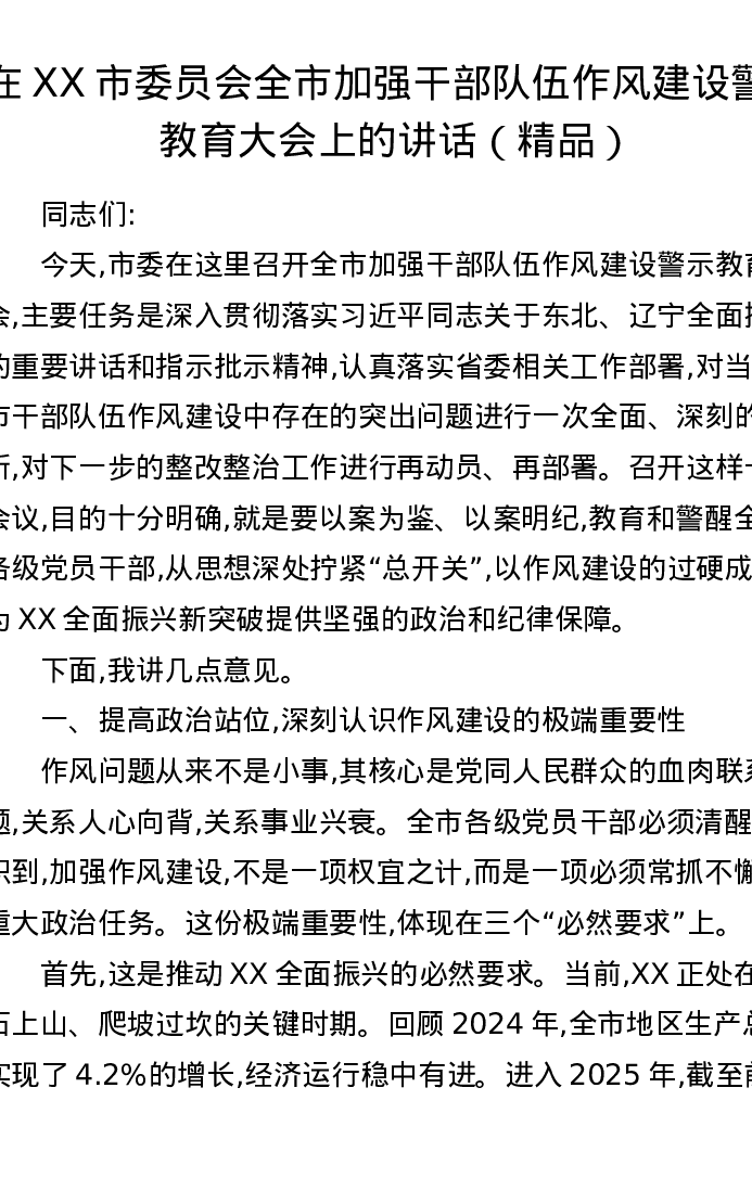 在XX市委员会全市加强干部队伍作风建设警示教育大会上的讲话