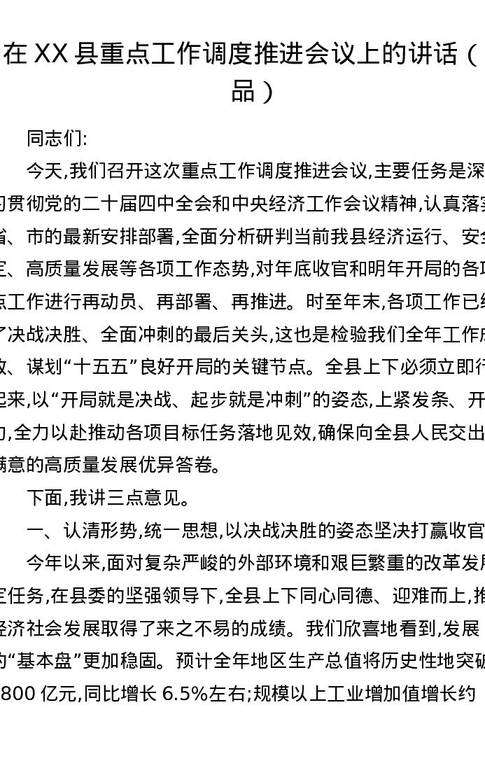 在XX县重点工作调度推进会议上的讲话