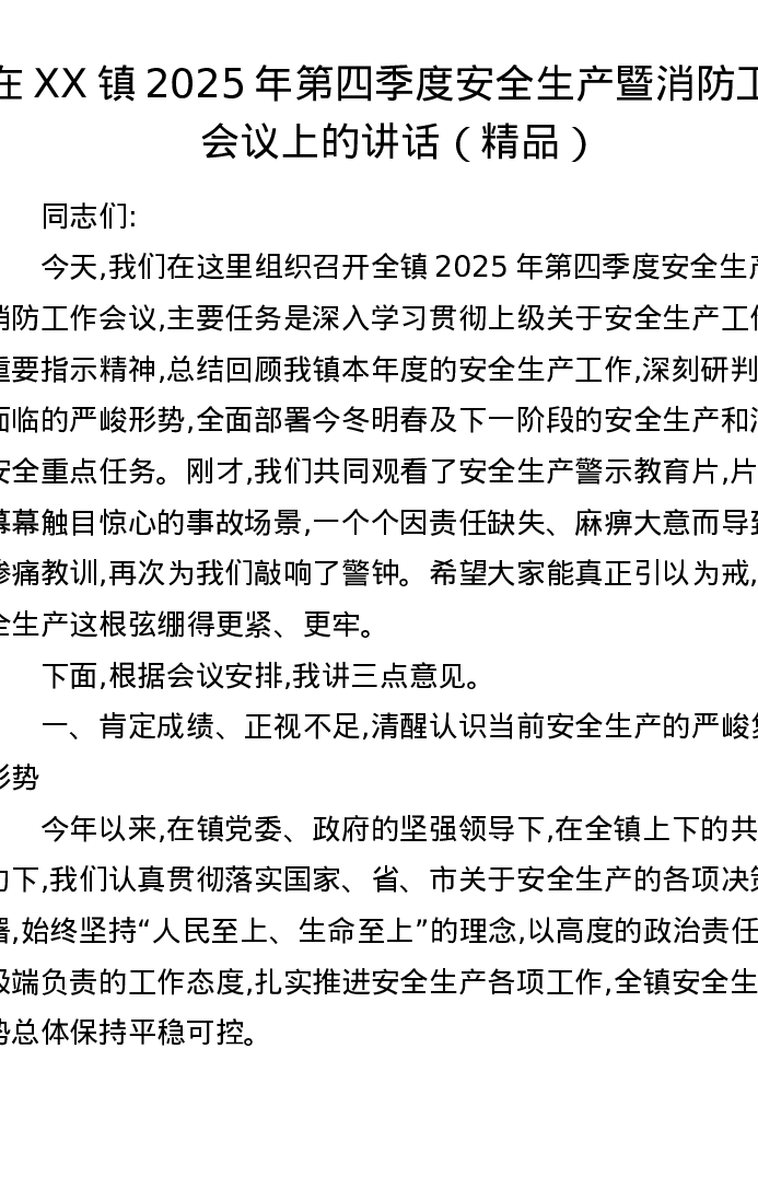 在XX镇2025年第四季度安全生产暨消防工作会议上的讲话