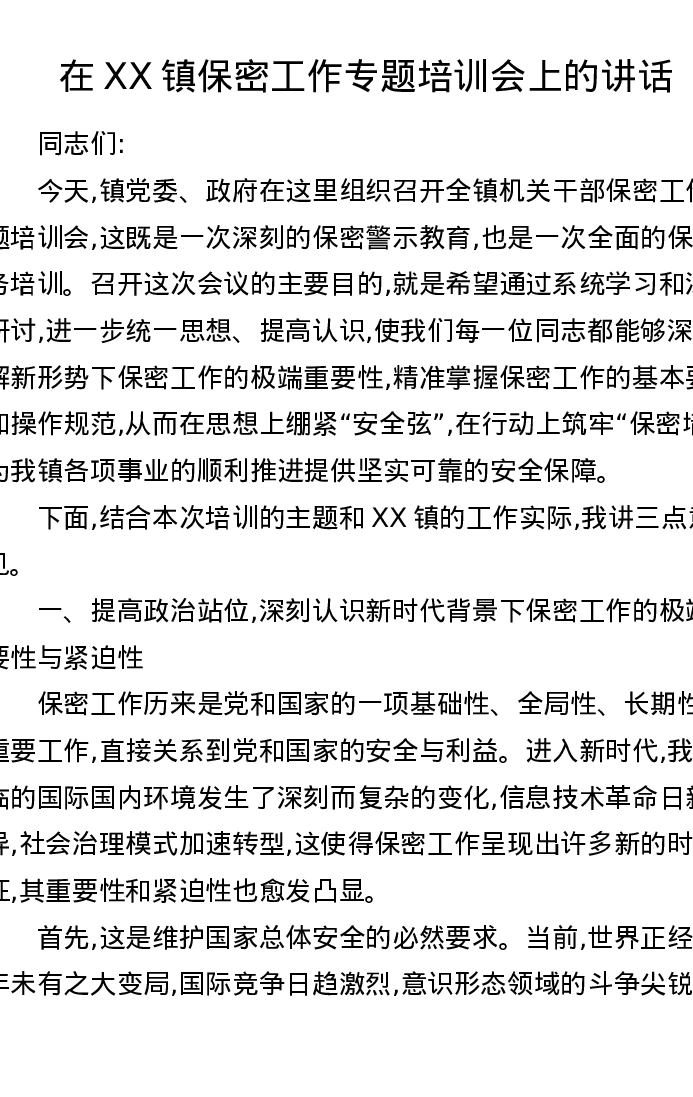 在XX镇保密工作专题培训会上的讲话